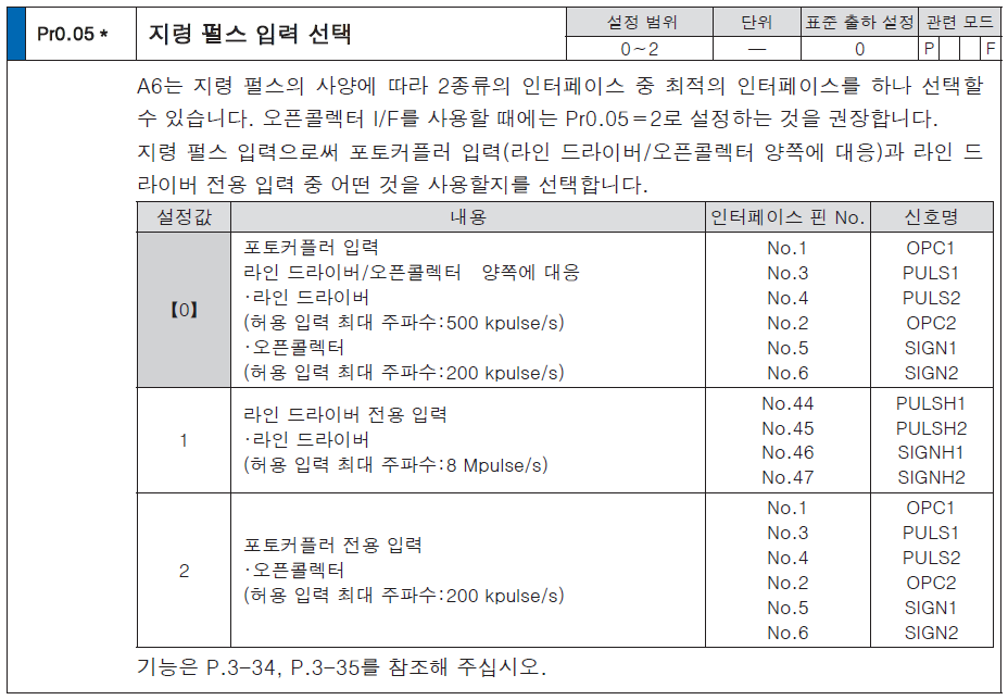 | Pr0.05 | 지령펄스입력선택 | 2 | |