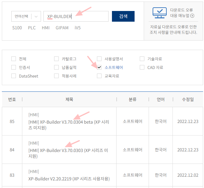85번과 84번 중 아무거나 받으면 된다. 여기서 “XP 시리즈 미지원”이란 것은 LS HMI의 한 제품군 중 단종된 제품군인 XP 시리즈를 말하는 것이다. 이름은 XP-BUILDER이면서 “XP 시리즈 미지원”이라는 문구가 보여서 약간은 황당해서 찾아보았다.