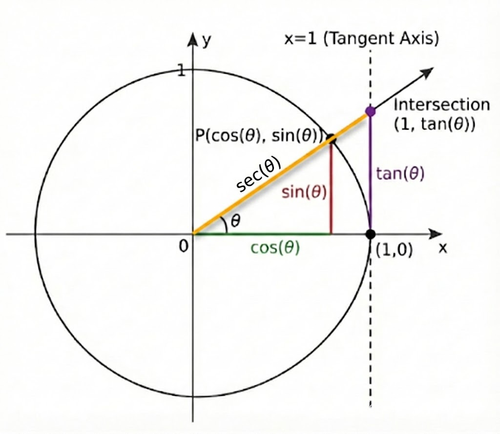 - tan: 원에 접하는(tangent)가 점 P를 지나는 직선(할선. secant)과 만나는 점까지의 거리. 좌표값=$(1, tan \theta$)