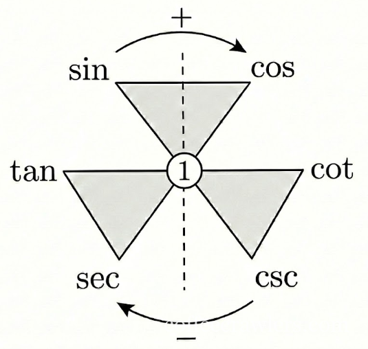 삼각형 세 개를 바람개비처럼 배치하고 가운데에 1을 둔다. 그리고, 좌측에는 원본 함수인 $sin, tan, sec$를 쓰고 우측에는 여각 함수를 쓰면 된다. $ cos, cot, csc$