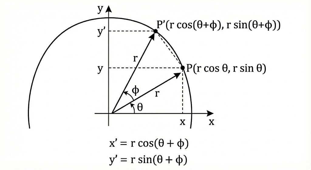 그런데 종종, 이러한 회전은 행렬로 표현된다. 그리고 이러한 유도는 덧셈공식을 이용한다.