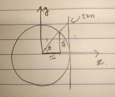 우측 접선까지의 거리는 1, 접선과 $\theta$ 각도를 이루고 탈출하는 선이 만나는 곳의 각도는 $90˚-\theta$가 된다.