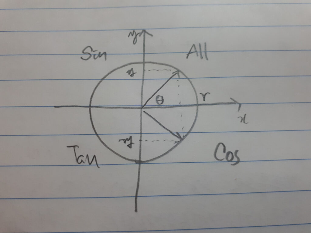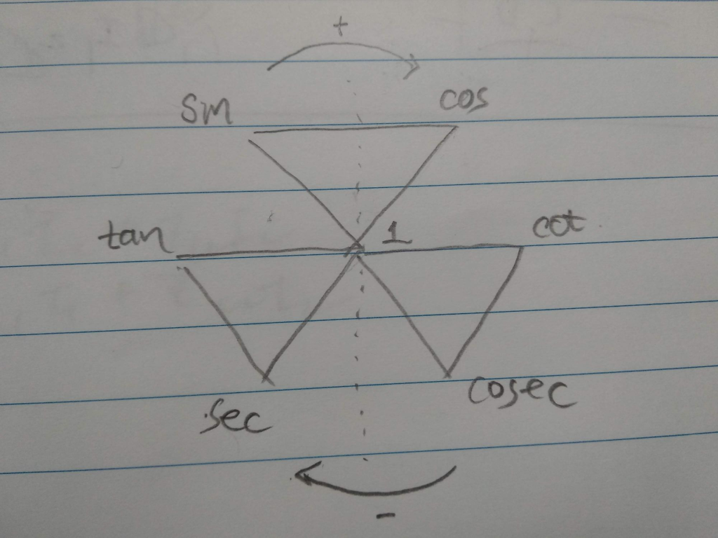 예) tan는 1을 지나면 cot, cos는 1을 지나면 sec, sin은 1을 지나면 cosec.
