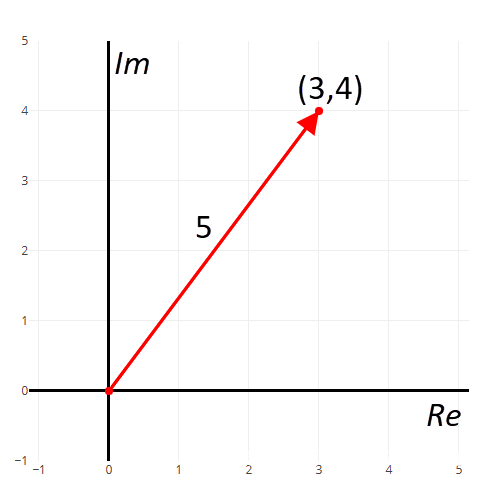 앞서 본 (3, 4) 벡터는 복소평면에서 $3 + 4i$ (또는 $3 + 4j$)라는 복소수로 표현된다.