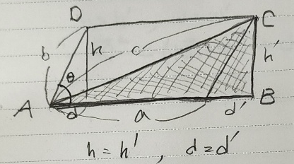 평행사변형의 대각선의 길이(점A와 점C간)이 거리를 구하는 공식은 $\sqrt{a^2 + b^2 + 2ab Cos \theta}$이다.