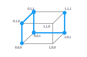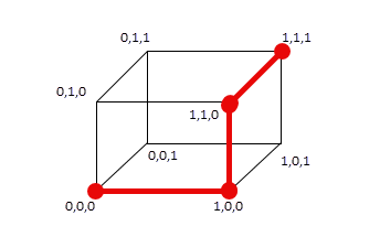 그러면 3비트의 최대거리는 (0,0,0)과 (1,1,1)에서 해밍거리는 3비트가 만들어 내는 최대의 거리 3 해밍거리를 가진다. 두 개의 문자열을 동일하게 바꾸기 위한 방법이 각 비트를 하나씩 변경하면서 만들면 된다.