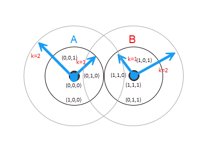 먼저 그림 3. 을 보자. 이 그림을 보면, 1개 오류가 발생토록 해밍거리는 d=1이다. 그것은 A유효코드워드와 B유효코드의 굵은 선으로 둘러쌓인 반지름이 k=1인 각각의 원이된다. 이 때의 반지름을 일반화해서 패킹반경(k)라고 정의해보자. 단, 패킹반경은 정수이다.
