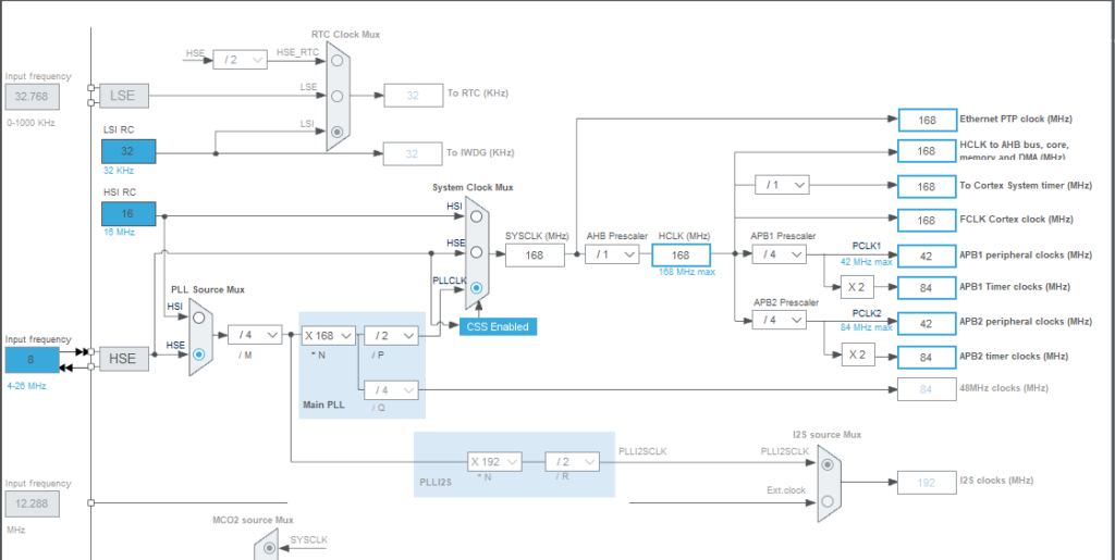 클럭설정을 다음과 같이 변경한다. 보통은 HCLK를 168로 적어주고 엔터를 치면 자동으로 변경된다. 단, 변경 중에 붉은색 바탕으로 변하는 것들이 나오는데, 이럴때는 자동으로 변경하지 말고 값들을 직접 조정해 주면 된다.