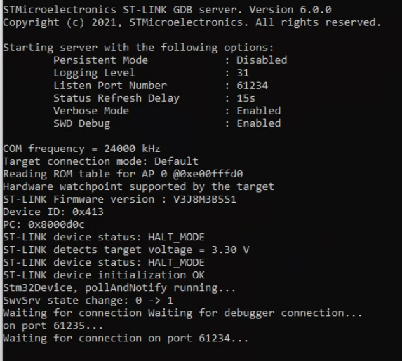 3. Then, the GDB server connects to the STM32 device using the ST-LINK JTAG and waits for commands from a GDB debug session.
