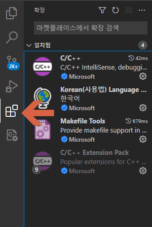 makefile를 입력창에 넣은 후 검색결과 최상단에 뜬 것을 다운로드 하면 된다. Makefile Tools라는 플러그인이다. 이걸 깔면, C/C++ 플러그인이 디펜던시 때문에 자동으로 깔린다. (한국어는 마음의 평화를 위해서 깔았다.)