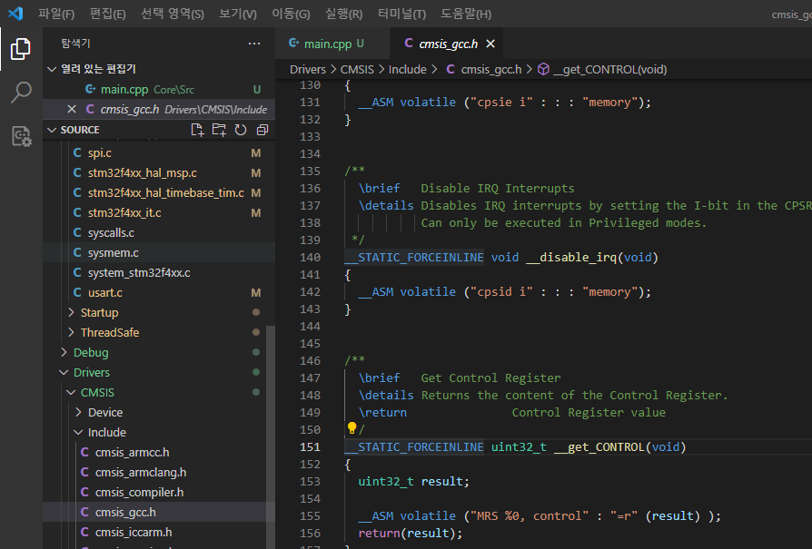 CubeMX는 .C문서를 만들어 낸다. 이것을 CPP에서 컴파일하기 위해서 위와같이 변형하였다. 물론, main.c 파일의 이름을 main.cpp로 변경해 주어야 한다.