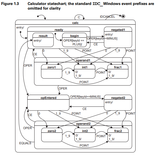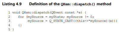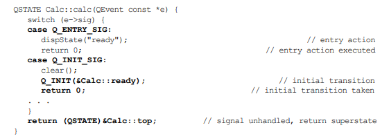 상태 핸들러 메소드는 애플리케이션의 실제 작업을 수행한다. 상태핸들러는 Calc 클래스의 멤버이기 때문에 모든 속성에 접근할 수 있다. 상태 핸들러는 이벤트 인스턴스의 상수 포인터(QEvent cont *)를 받아들인 뒤, 이 인스턴스가 이벤트를 처리했으면 0을 반환하고, 그렇지 않으면 상위상태, 더 정확히는 상위상태 핸드러 메소드의 포인터를 반환한다.
