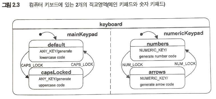 시스템의 비헤비어를 독립적으로 활성화 되는 여러 부분으로 나눌 경우, 직교영역(독립적인 관계)은 상태의 수가 폭발적으로 증가하는 문제를 해결한다. 보통 독립된 관계는 외적(각 상태의 갯수를 곱해줌)하나, 직교영역은 그림 2.3처럼 각 상태의 합만을 취할 수 있게 만들어 준다.