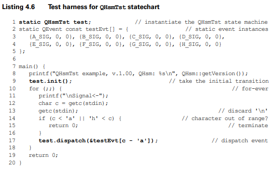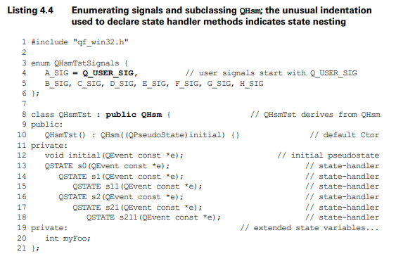 상태 핸들러라는 것은 상태를 핸들링하는 메소드를 말한다. 왜 핸들러인가? 상태를 변경해 주는 역할을 하기 때문이다. (나중에 qm.exe를 다루다 보면 housekeeping code를 다이어그램이 만들어 준다.)