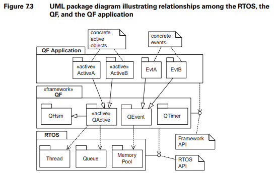 상태머신과 능동객체 기반 컴퓨팅은 진정한 범용 개념이고, RTOS와 견고하게 통합돼야 한다. 이러한 통합에 따른 장점은 최소 세 가지다. 첫째, 능동객체는 상호배제와 블로킹에 기반을 둔 기존의 스레딩보다 더 안전하고 나은 컴퓨팅 모델을 제공한다. 둘째, QF 구현에 필요한 개념의 제공을 통해, RTOS에서 기존에 지원했던 많은 매커니즘의 필요성을 없앴다. 따라서 통합 시스템은 RTOS 자체보다 더 크지 않을 것이다. 세번째, 이러한 통합 RTOS는 개방형 아키텍처 구축에 필요한 표준 소프트웨어 버슨를 제공한다.