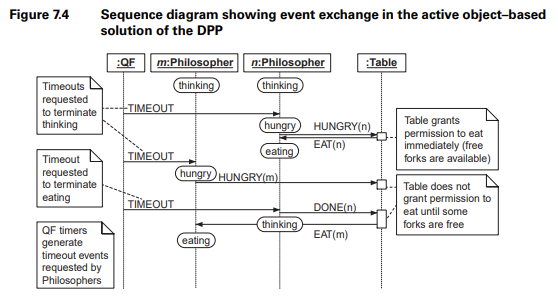 myFork[] 속성과 isHungry[] 속성은 이 상태의 정량적인 면(확장상태변수)을 나타낸다. Table 능동객체는 EAT_SIG를 발생시키며, HUNGRY_SIG과 DONE_SIG 시그널을 받아들인다.