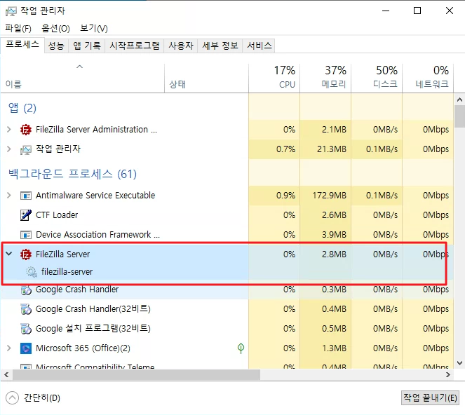 위와 같이 만들어졌으면, 재부팅하면 아래처럼 FileZilla Server 프로세스가 올라와 있음을 확인 할 수 있다.