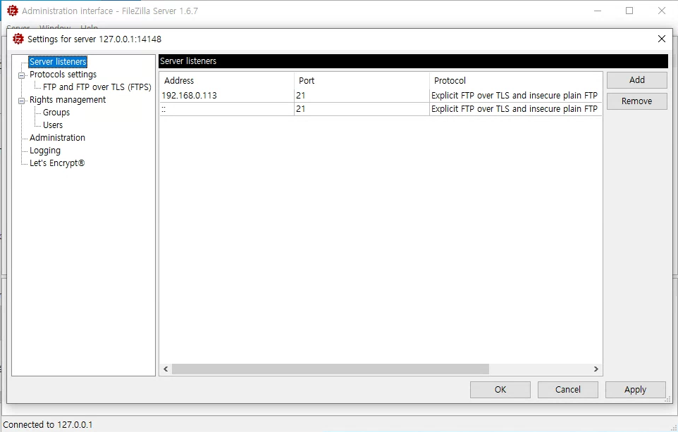 그리고 FileZilla Server Administration을 더블클릭한 후, 아래와 같이 설정한다.