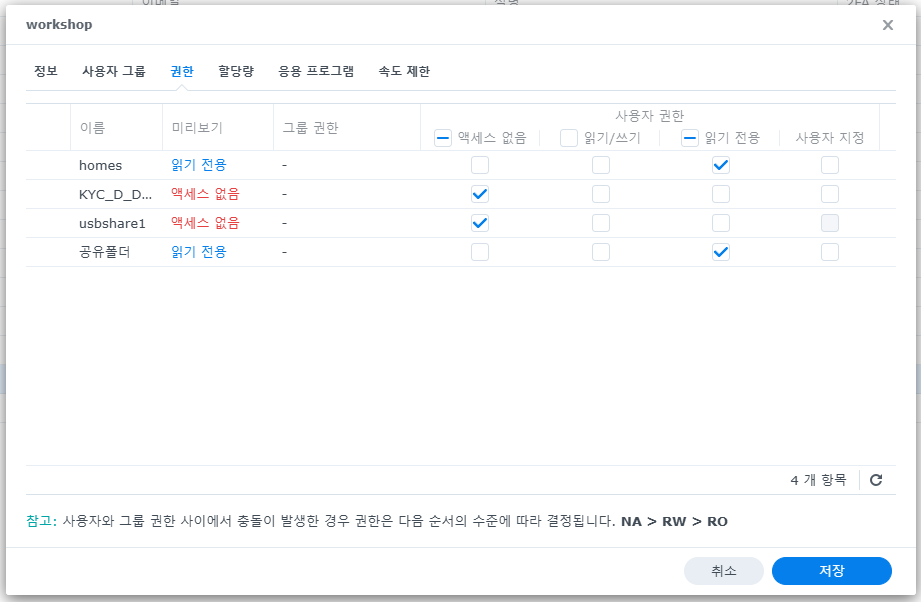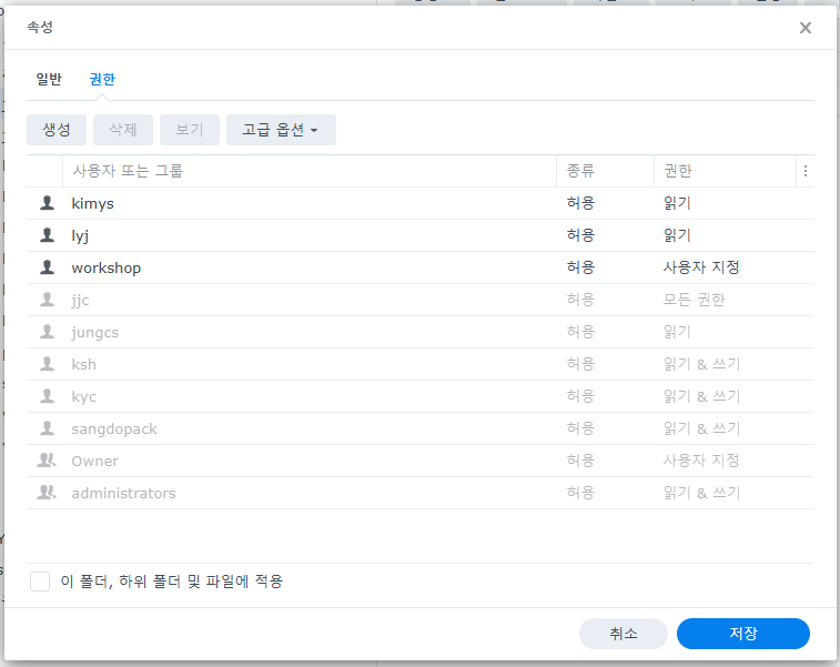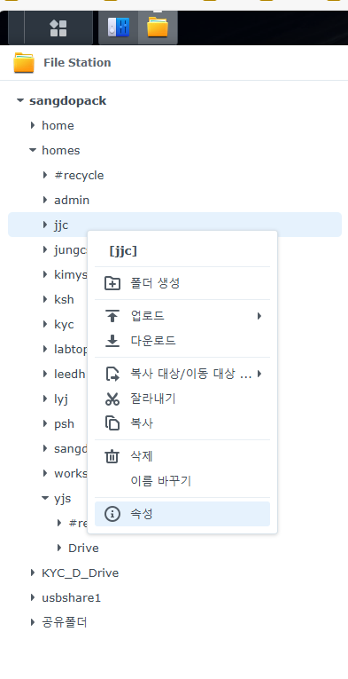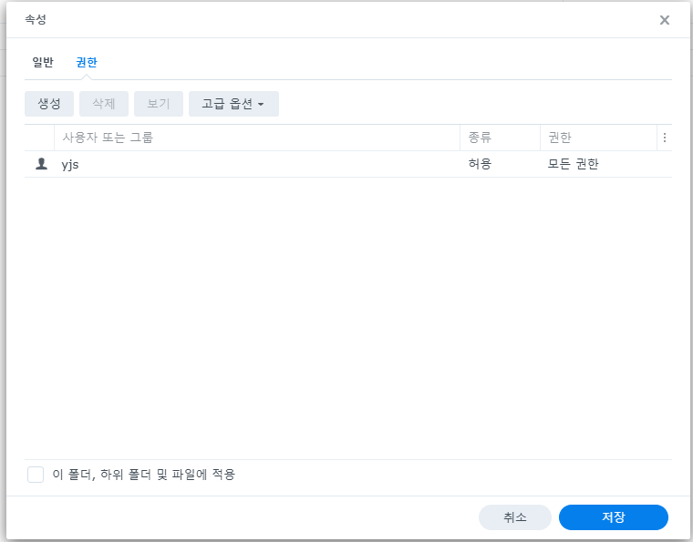 yjs폴더에 접근 금지를 하려면, 파일스테이션>yjs>속성>권한