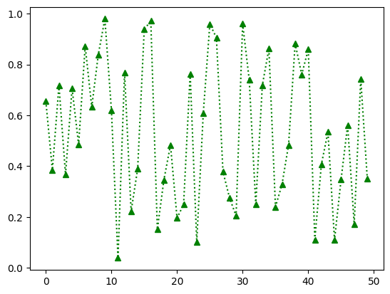 import numpy as np import matplotlib as mpl import matplotlib.pyplot as plt N=50 x=np.arange(N) y=np.random.random(size=N) plt.plot(x,y,'g^:')