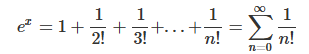 $$e^{ix} = 1 + \frac{(ix)}{1!} + \frac{(ix)^2}{2!} + \frac{(ix)^3}{3!} + \frac{(ix)^4}{4!} + \frac{(ix)^5}{5!} + \cdots$$