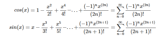즉, $cos(x)$는 다항식의 짝수항 만, $sin(x)$는 홀수항 만 써 놓은 후 삼각함수가 +와 -로 순환하는 것을 그대로 써 놓으면 된다. 물론 차수의 팩토리얼로 나누어주는 것은 기억해야 된다.
