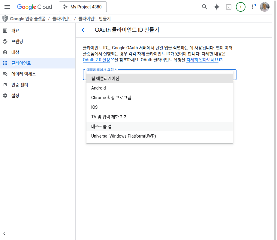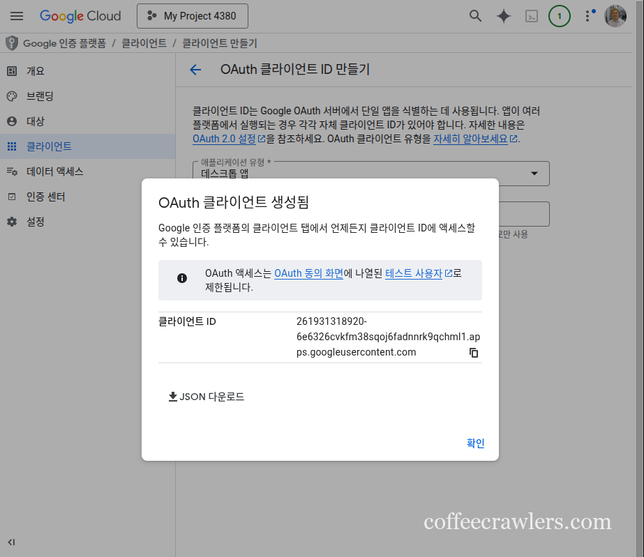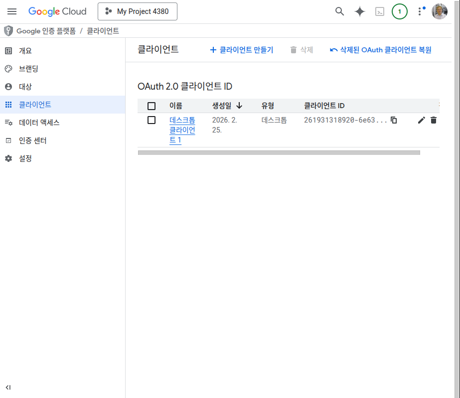 - 메뉴 > 클라이언트 > OAuth2.0 클라이언트 ID > 데스크톱 클라이언트1