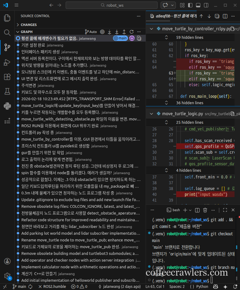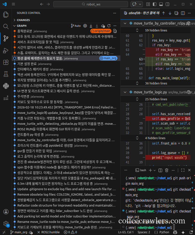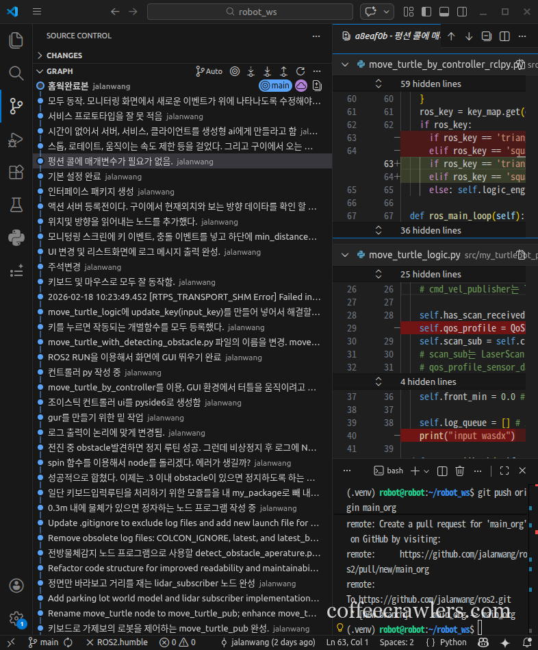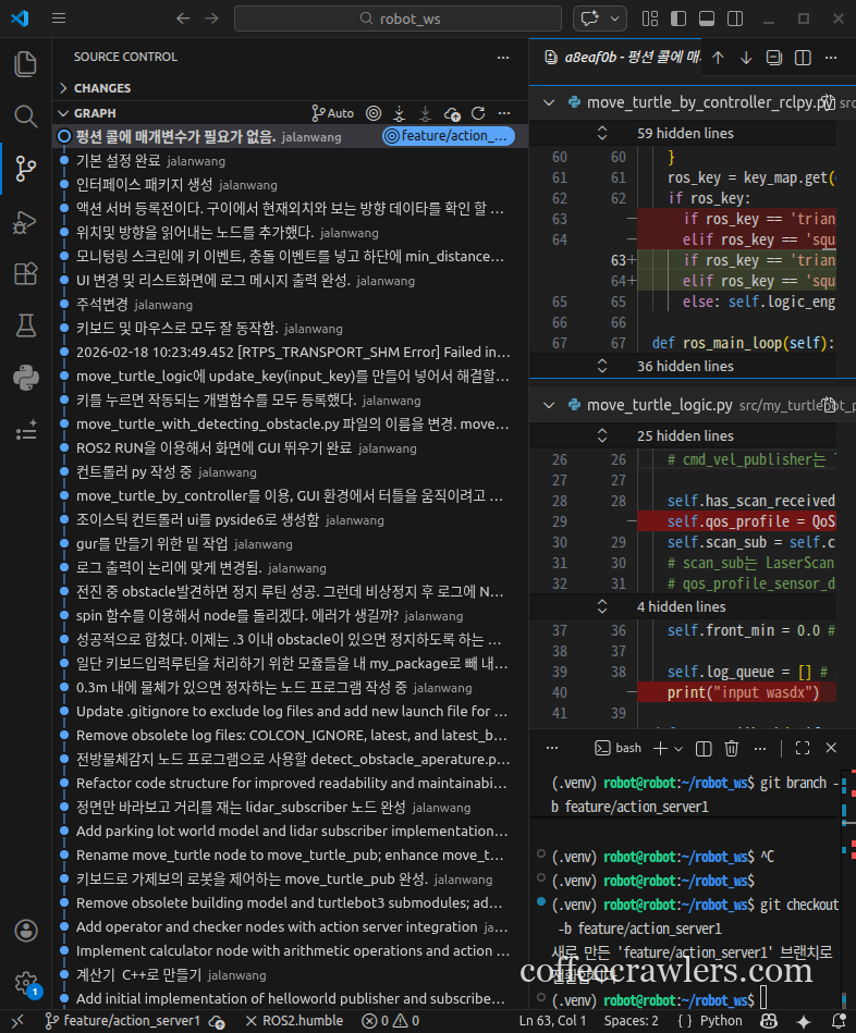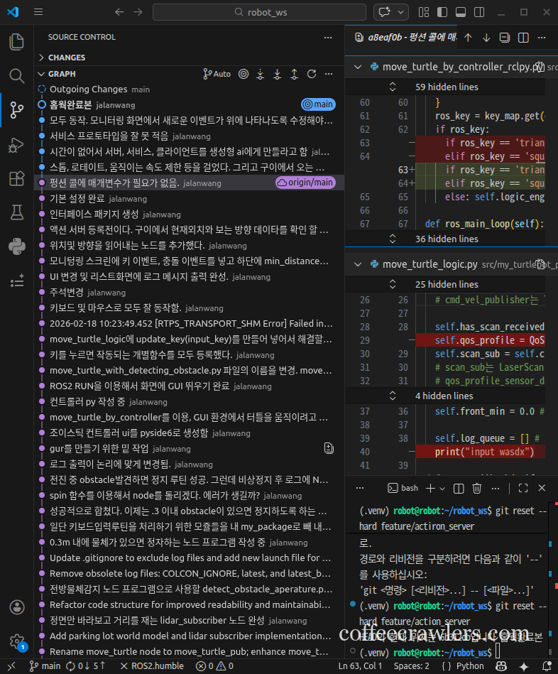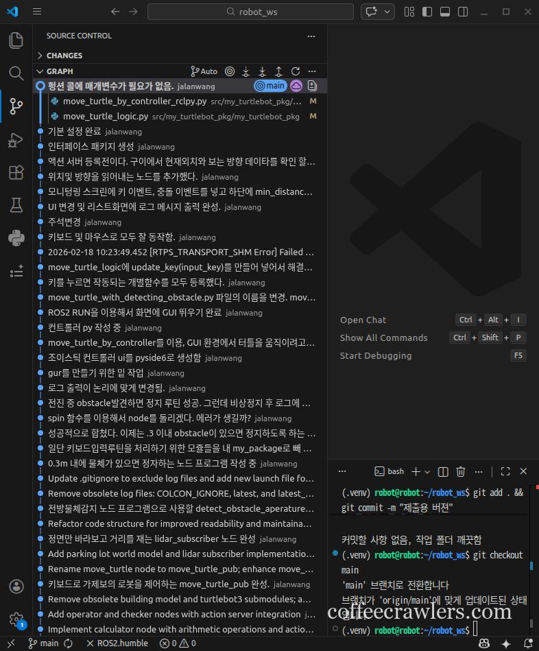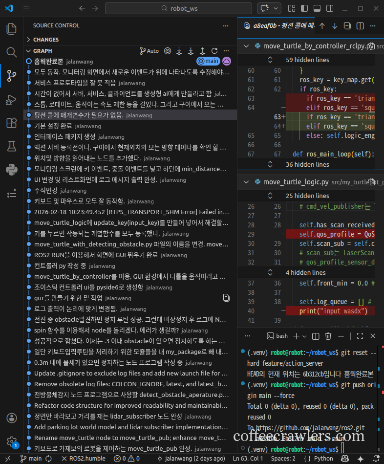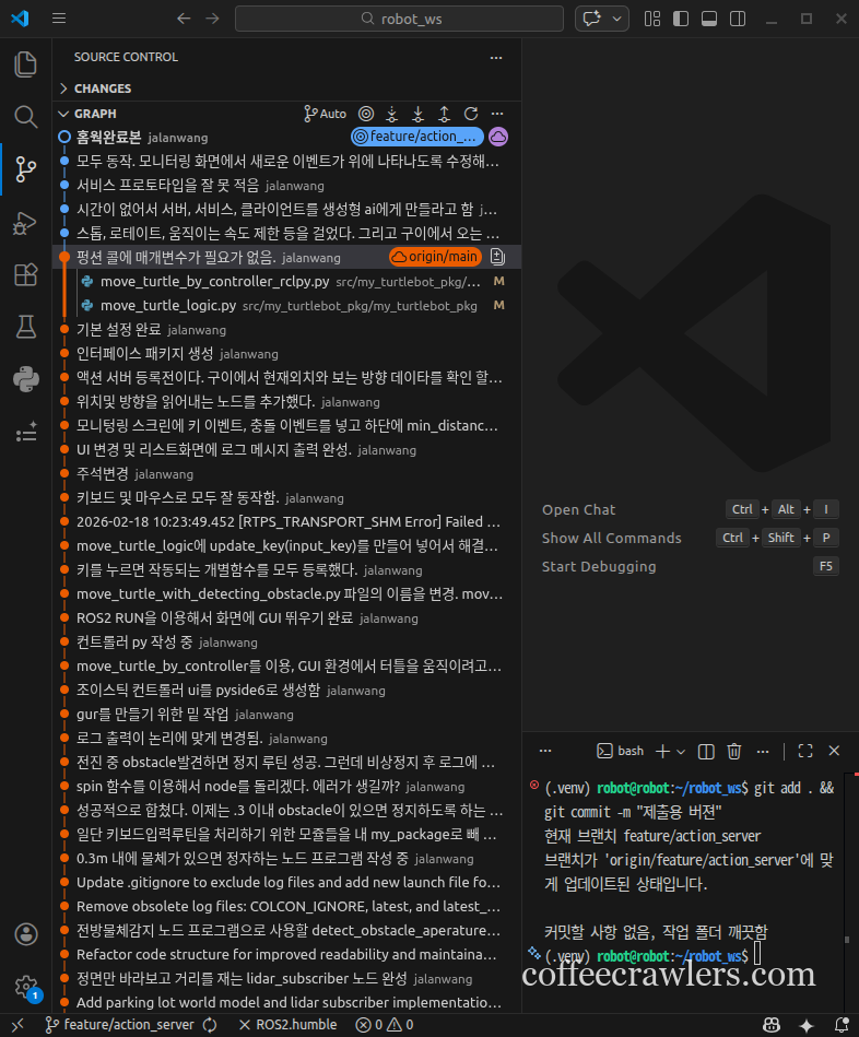 (.venv) robot@robot:~/robot_ws$ git branch feature/action_server * feature/action_server1 main main_org (.venv) robot@robot:~/robot_ws$ (.venv) robot@robot:~/robot_ws$ git log --oneline --graph --all * 6b312cb (origin/main, origin/feature/action_server, main, feature/action_server) 홈웍완료본 * d91a289 모두 동작. 모니터링 화면에서 새로운 이벤트가 위에 나타나도록 수정해야 됨. * 152f0af 서비스 프로토타입을 잘 못 적음 * 204a74d 시간이 없어서 서버, 서비스, 클라이언트를 생성형 ai에게 만들라고 함 * 6326dfb 스톱, 로테이트, 움직이는 속도 제한:
