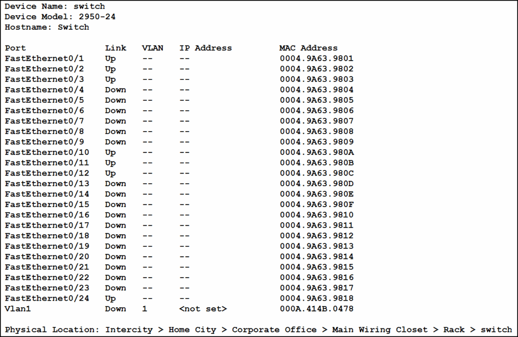 - IP 주소는 물리적으로 연결된 호스트의 IP 주소를 학습한 후 나타난다. 프레임 교환이 일어나면, IP Address 및 MAC Address에 학습값이 채워진다.