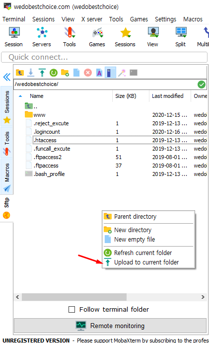 MobaXterm에서 마우스 오른쪽 버튼 클릭 한 후, Upload to current foler 선택.