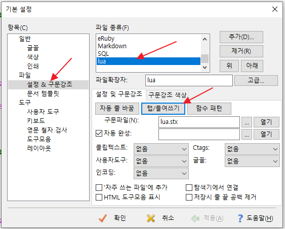editplus2 에서 탭을 스페이스 4칸으로 설정하기8월 13, 20211월 2, 2026 메뉴>도구>기본설정 설정&구문강조->파일종류->lua 탭들여쓰기->탭크기->4 답글 남기기 응답 취소이메일 주소는 공개되지 않습니다. 필수 필드는 *로 표시됩니다이름 * 이메일 * 웹사이트 댓글 * 다음 번 댓글 작성을 위해 이 브라우저에 이름, 이메일, 그리고 웹사이트를 저장합니다. Δ