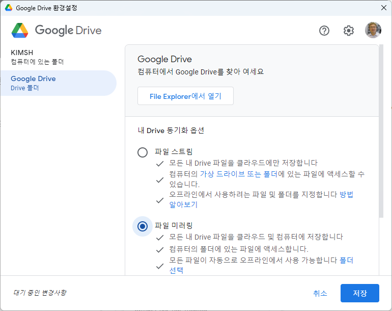 과거 본인은 클라우드에 저장된 구글 드라이브에서 내가 저장한 파일이 날라거면 어쩌나하고 걱정해서 파일 미러링을 선호했는데 지금은 “내 드라이브”를 미러링이 아닌 스트리밍 싱크 방식으로 변경할 생각을 하고 있다. 네트워크 속도도 향상되었으며 특히 로칼 하드디스크에서 일어날 수 있는 문제(화재, 도난, 파손 및 해킹 등등)가 더 많은 상황이기 때문이다.