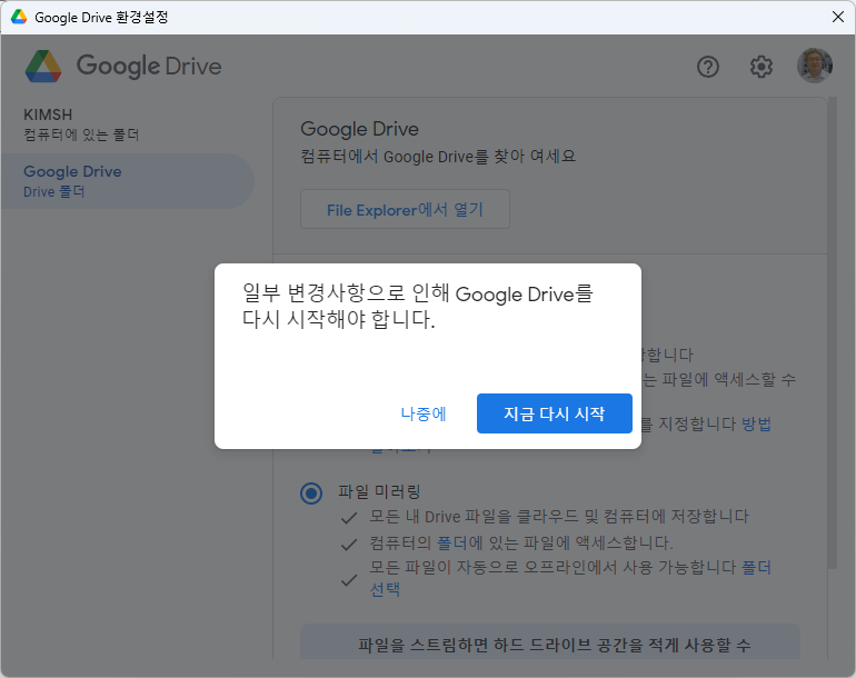 “저장” 버튼을 누르면 “지금 다시 시작”버튼을 눌러서 다시 구글드라이브 데스크톱을 실행한다.