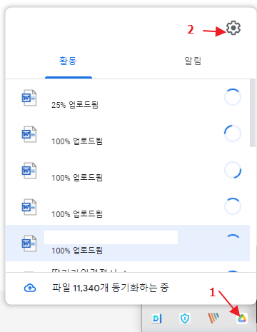 설정 방법은, 태스크 바의 ‘구글드라이브아이콘’을 클릭 한 후 상단의 톱니바퀴를 눌러 구글드라이브 알람화면으로 이동한다.