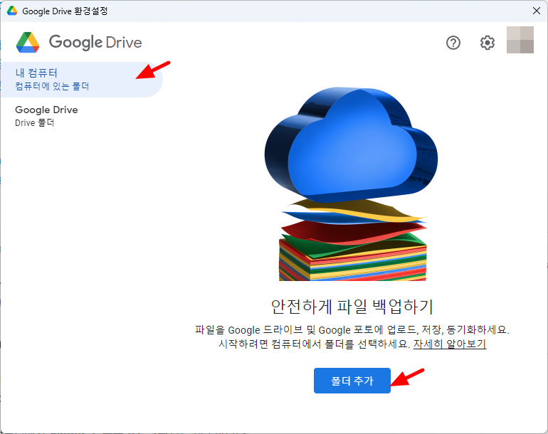 먼저 “내 드라이브”는 전체 싱크용이고 “다른 컴퓨터”는 말 그대로 내 계정으로 연결된 다른 컴퓨터의 특정 폴더를 말한다.