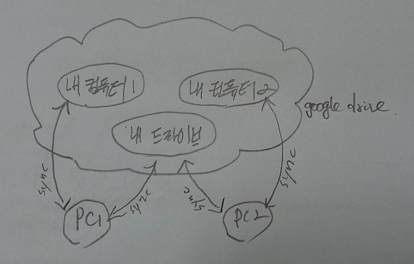 여기서 전체 싱크라는 말을 했는데 이는 사용자가 “내 드라이브”에서 파일 작업을 하면 클라우드 구글드라이브의 “내 드라이브”의 내용이 변경되며 또한 내 계정으로 로그인된 전체 컴퓨터의 로칼 드라이브의 “내 드라이브” 폴더 내용도 함께 변경되기 때문이다.