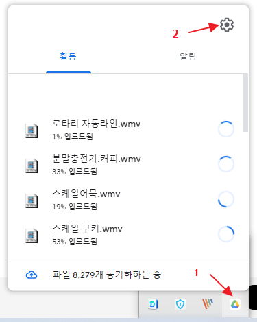먼저 구글 드라이브를 깔고 작업표시줄의 숨겨진 아이콘에서 구글 드라이브 클릭 후, 톱니 바퀴 선택한다.
