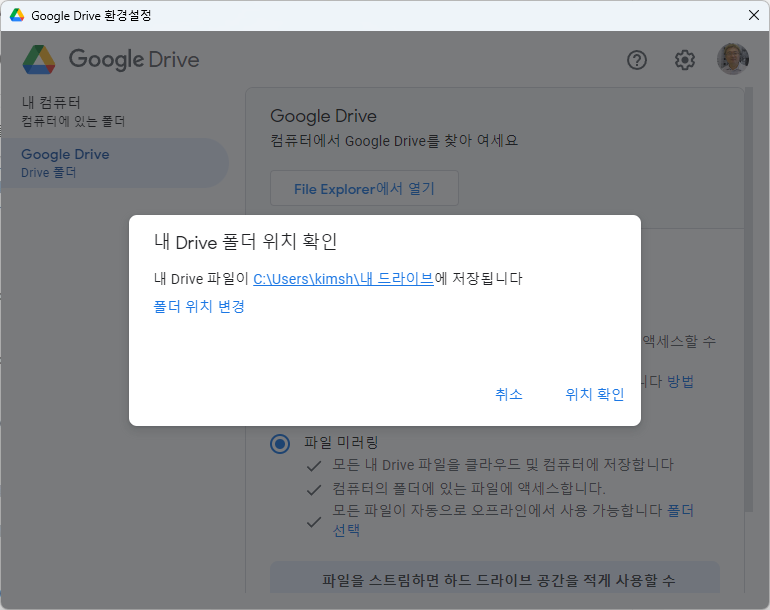 Google Drive/Drive 폴더 클릭 한 후, 파일 미러링 클릭한다.