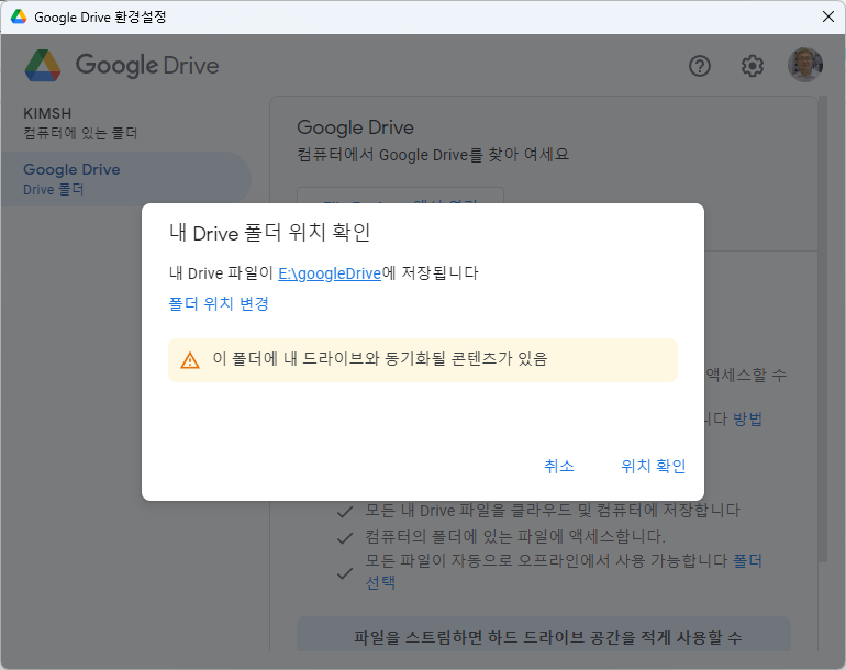 브라우저 창이 뜨면 D:\googleDrive를 클릭한 후 “위치 확인” 버튼을 클릭한다.