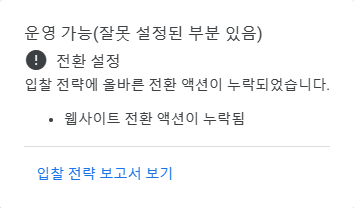아마도 캠페인을 생성할 떄, 입찰 전략을 “전환수 최대화”로 설정한 후 관련된 “전환 설정”을 부정확하게 구성하거나 또는 요구되는 관련 데이타값을 구글애즈가 충분하게 확보하지 못하는 경우에 나타나는 것 같다.