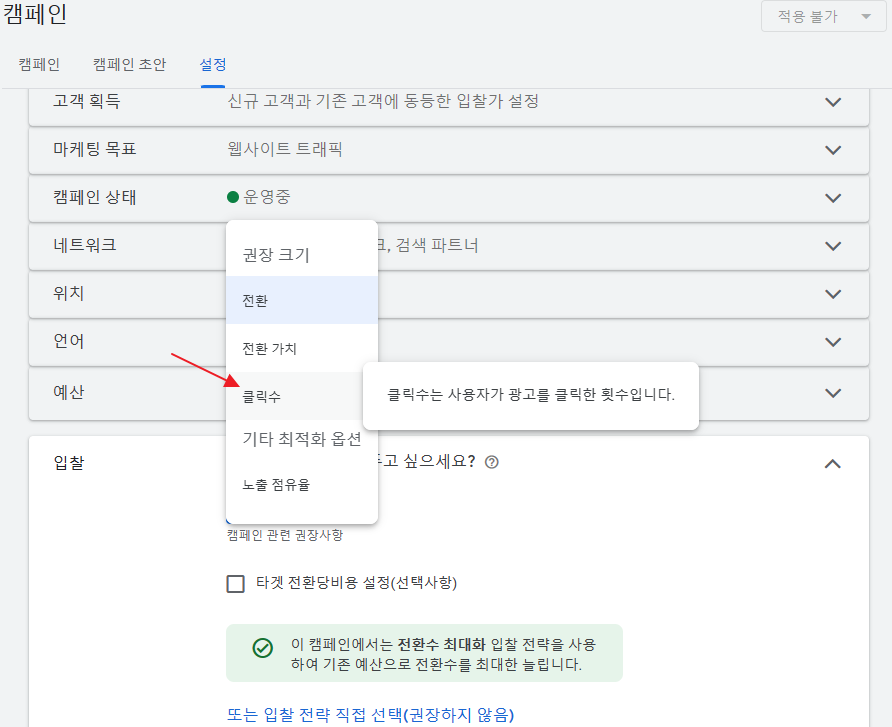 드디어 입찰 방식을 변경할 수 있는 입력창이 떴다. “전환수 최대화”를 클릭한다.