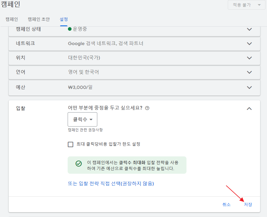 “클릭수”로 변경한다. “최대 클릭당비용 입찰가 한도 설정”을 하면 한 클릭당 입찰가를 수동으로 설정할 수 있는 창이 뜬다. 여기서는 이 옵션을 체크하지 않고 “저장”버튼을 눌렀다.