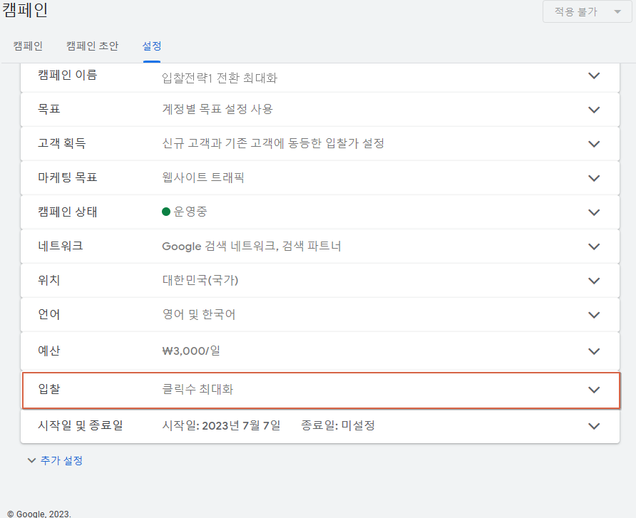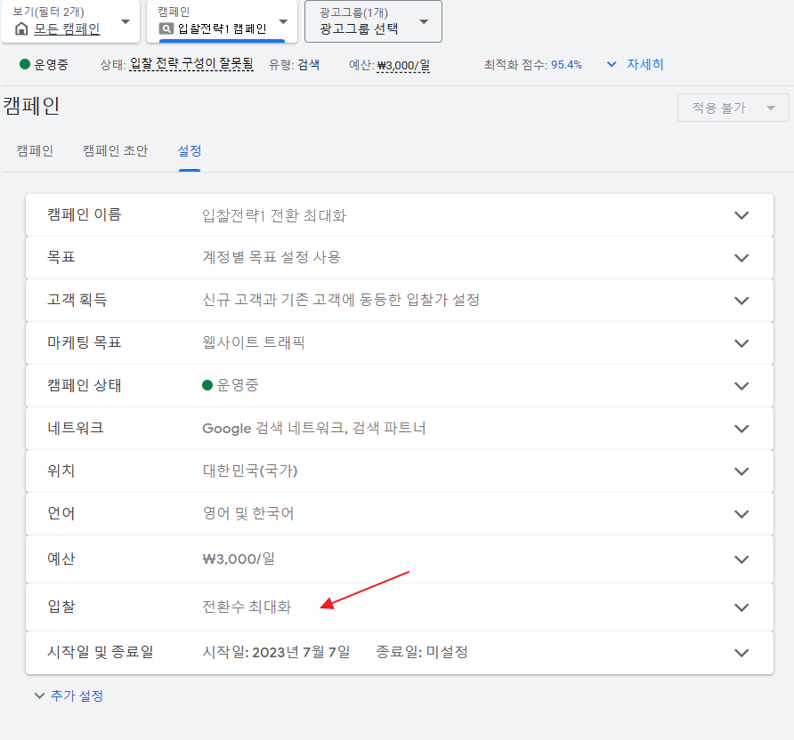 아래에 “입찰 전략”이 변경된 화면이 나타나면 성공!