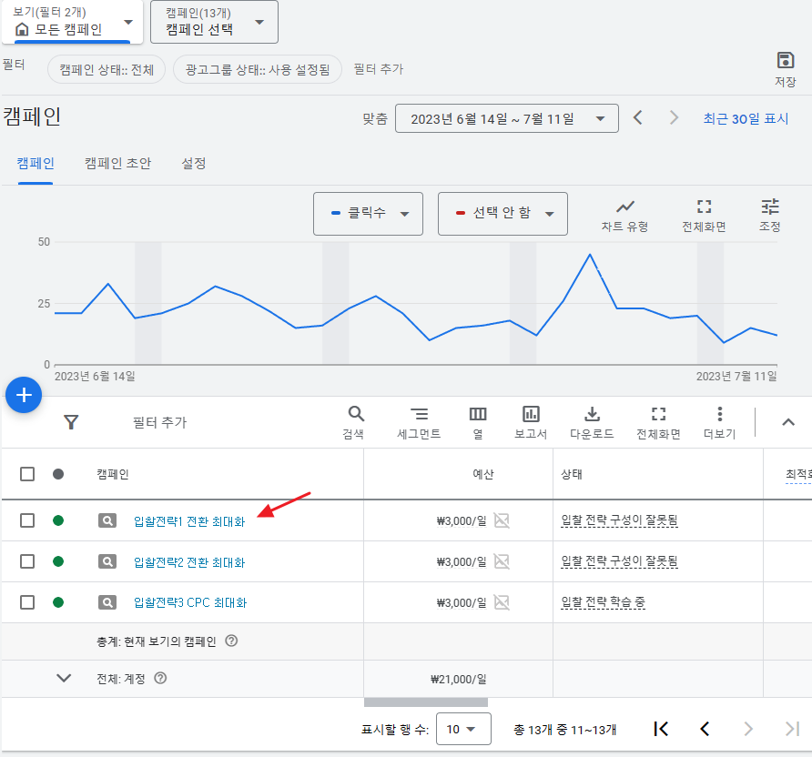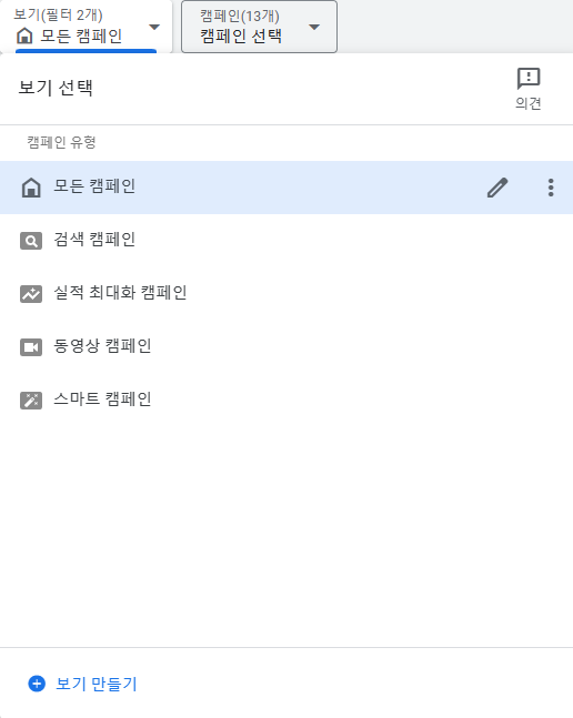 본문 창의 윗 영역은 “필터 설정” 영역이다. 필터를 적절히 조절한 후 “모든 캠페인”을 누른다.