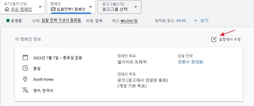 “이 캠페인 정보” 우측의 “설정에서 수정”을 클릭한다.