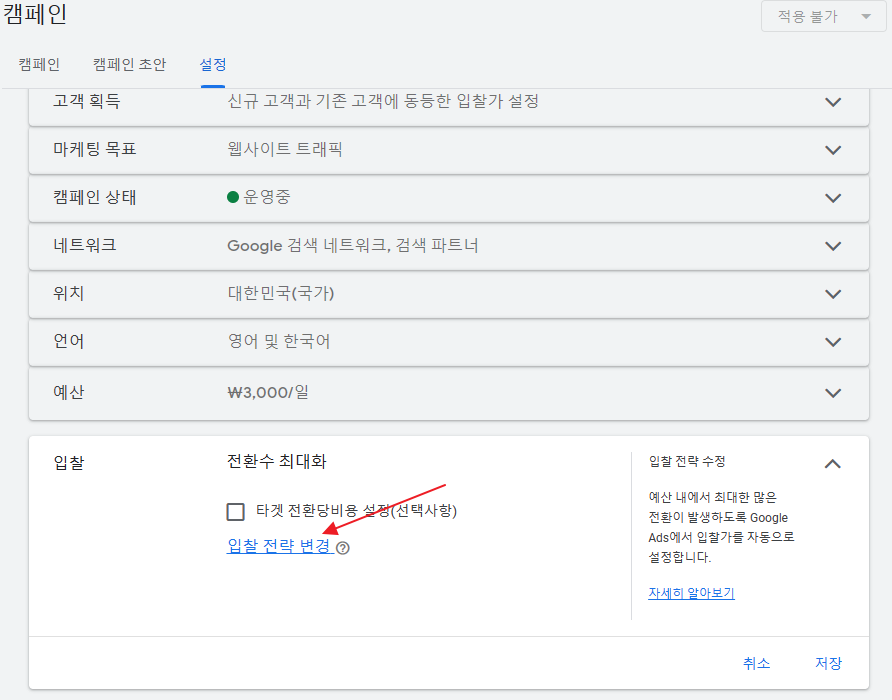 윗 글을 읽고 바로 CPC로 옮겨타려고 했다. 그런데 캠페인 생성할 때는 입찰 방식을 설정하는 것이 쉬웠는데 이를 변경하려고 보니 찾기가 매우 어려웠다. 그래서 아래에 그 링크의 위치를 여러 그림과 같이 나타내본다.