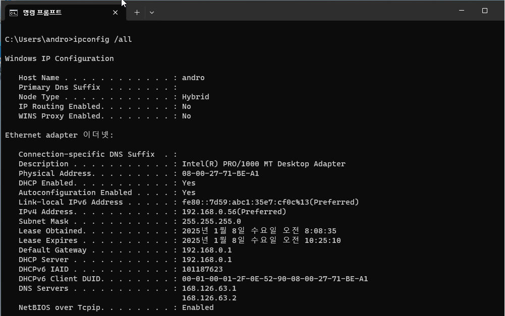 이러면 내 컴퓨터에 달린 네트워크 어댑터에 설정된 ip 정보가 이더넷2에 적용된다. 즉, ‘이더넷2’가 ‘이더넷” 네트워크에 연결된 것처럼 동작한다는 의미이다.
