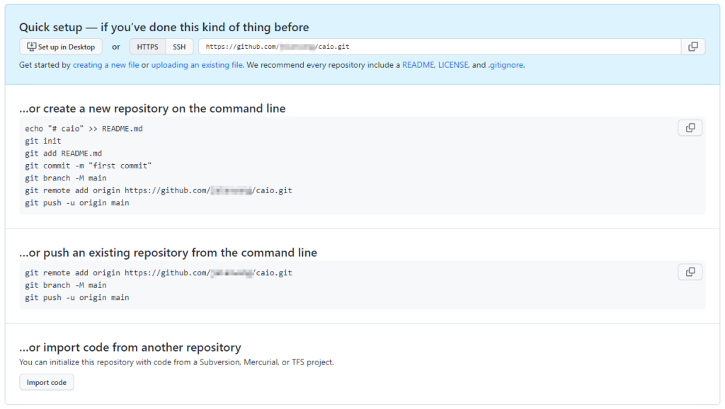 | Quick setup if you’ve done this kind of thing before … (패스워드를 물어보면 쳐주고 안물어보면 넘어간다. 깃허브에 계정을 만들고 계정에 로그인하는 것을 로컬에서 한 번이라도 수행했다면 위 과정은 필요없는 것으로 보인다.) or create new repository on the command line 내 로칼디렉토리를 깃허브에 연동하려면 아래단계로 간다. echo “#caio” >> README.md git init git add README.md git commit -m “first commit” git branch -M main git remote add origin https://github.com/my_git.git git push -u origin main or push an existing repository from the command line 저장소가 이미 있어서 이 저장소를 깃허브에 연동하려고 한다. git remote add origin https://github.com/my_git.git git branch -M main git push -u origin main |