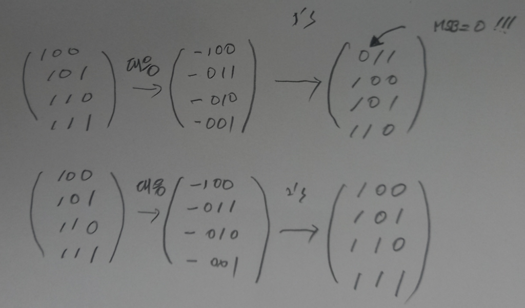 그런데 문제가 있다. 즉, 최상위 비트를 가지고 정수를 구분하면 2개의 2진수 값(000과 100)이 0을 표현하게 된다. 논리적으로 맞지 않게 되며, 최상위 비트를 읽어서 음수와 양수를 분리해 낼 수도 없다.