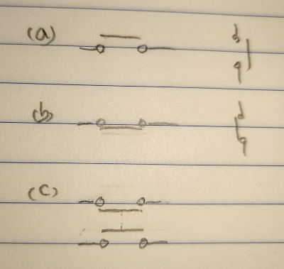 - B-접점은 누르지 않으면 연결되어 있는 스위치이다. 압정의 핀 위치에 주의한다. 회로의 접속점 하/좌 부분에 접해 있다.